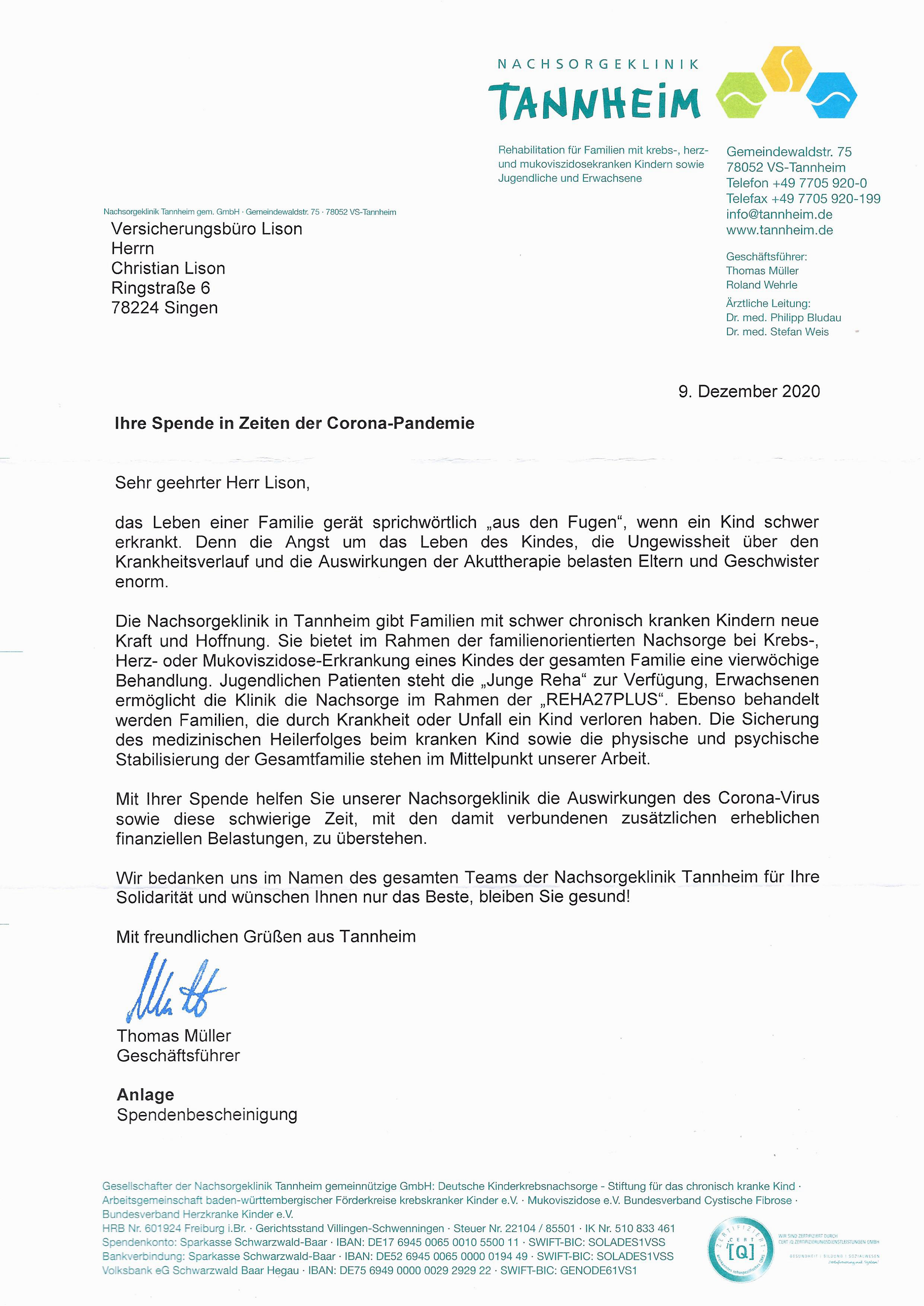 wir sorgen in unserem Betrieb nicht nur den optimalen Versicherungsschutz sondern Leisten auch aktive Hilfe und spenden zugunsten der Tannheim Klinik www.tannheim.de.